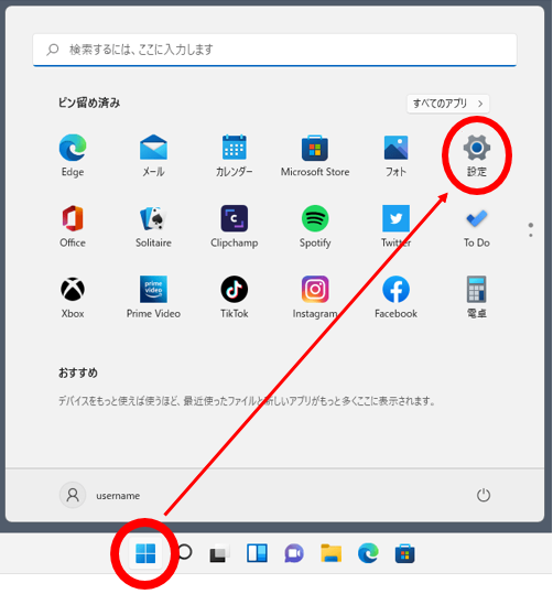 1.「スタート」をクリックし、表示されたメニューから「設定」をクリックします。