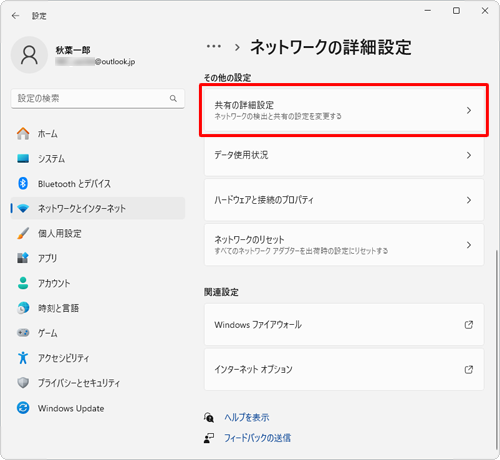 2.[ネットワークとインターネット]を開きます。つづいて[ネットワークの詳細設定]をクリックします。
