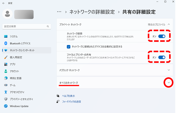 5.赤の破線部が両項目ともに[オン]であること確認し、[すべてのネットワーク]を開きます。