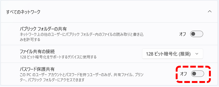 6.[パスワード保護共有]の赤の破線部を[オフ]に切り替えていただき、画面を閉じて終了です。